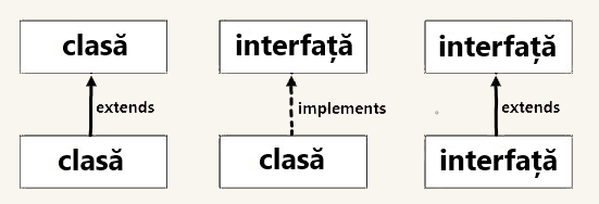 Așa cum se arată în figura dată mai jos, o clasă extinde o altă clasă, o interfață extinde o altă interfață, dar o clasă implementează o interfață.