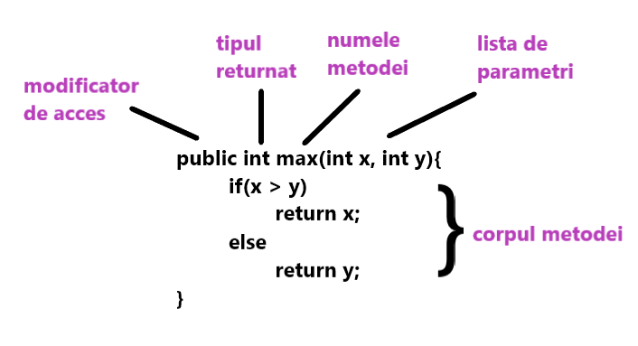 Corpul metodei: Este o parte a declarației metodei. Conține toate acțiunile care trebuie efectuate. Este închisă în perechea de acolade.
